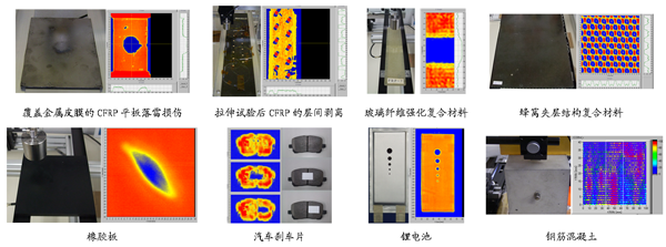 高灵敏度非接触空气耦合超声波检测系统突破了超声液态耦合限制并能实现高分辨率的超声C扫描系统。系统是通过对高能超声波发射接收器、高灵敏度空气耦合探头和低噪音前置放大器等装置的特殊设计,能够使得超声波透过空气发现工件内小于1mm的缺陷。此系统在碳纤维强化复合材料(CFRP)、玻璃纤维强化复合材料(GFRP)、蜂窝复合材料、锂电池、刹车片、钢筋混凝土、木材、石墨、橡胶以及材料胶接等方面检测具有独特优势。下图为,几种材料的检测结果展示: |