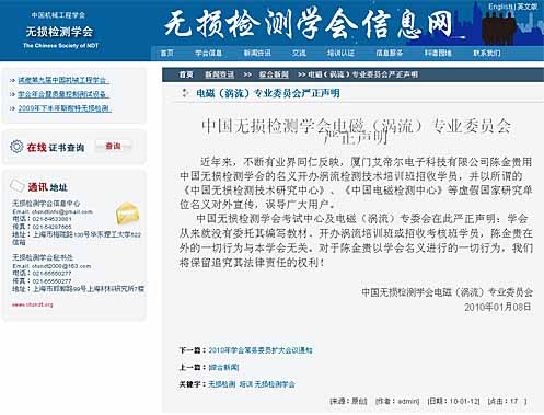 近年来,不断有业界同仁反映,厦门艾帝尔电子科技有限公司陈金贵用中国无损检测学会的名义开办涡流检测技术培训班招收学员,并以所谓的《中国无损检测技术研究中心》、《中国电磁检测中心》等虚假国家研究单位名义对外宣传,误导广大用户。 中国无损检测学会考试中心及电磁(涡流)专委会在此严正声明:学会从来就没有委托其编写教材、开办涡流培训班或招收考核班学员,陈金贵在外的一切行为与本学会无关。对于陈金贵以学会名义等进行的一切行为,我们将保留于追究其法律责任的权力!